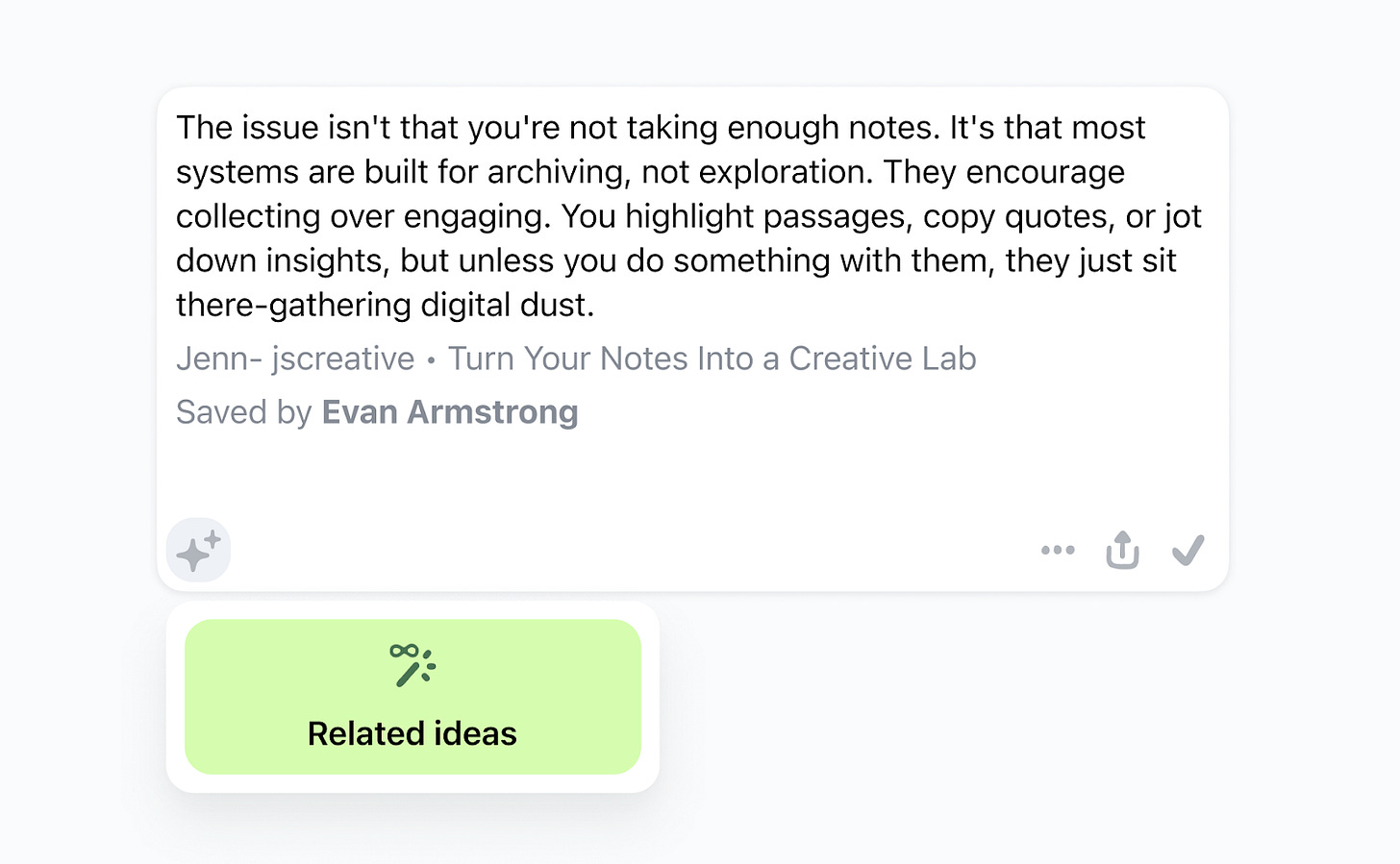 Sublime flips the job of notes. Users drop in an idea, and then fall down a delightful path of related ideas. The value comes from connecting ideas, not merely saving them. Essentially, it means that note-taking is more akin to going on a guided trip through the intellectual wilderness. For example, save a quote about note-taking, and up pops a related tab: