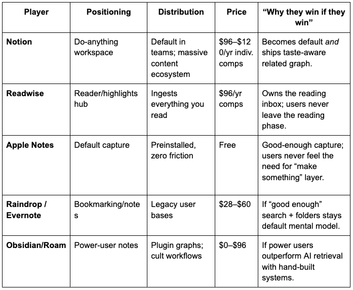 That’s the bet we’ll test in the rest of this piece: Can a tool that treats notes as creative fuel (not storage) turn every saved idea into a potential starting point for discovery and creation? Personal knowledge management and general productivity is an enormously challenging category for startups, so you have to be incredibly distinct just to survive.