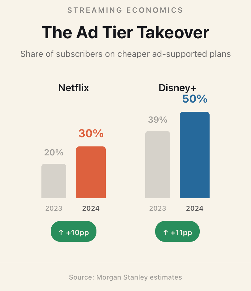 Streamers are losing commercial-free subscribers. I remember when the primary selling point of streaming was the lack of ads. Now, the streaming industry’s pivot to advertising is accelerating faster than anyone predicted. Morgan Stanley’s latest entertainment outlook found that ad-supported tiers now account for 30% of Netflix subscribers and a full 50% of Disney+ subscribers—up from 20% and 39% respectively just a year ago. More striking is that the firm estimates that all net subscriber growth in 2025 for both platforms came from ad-supported plans, while the number of users paying for ad-free viewing actually shrank.
