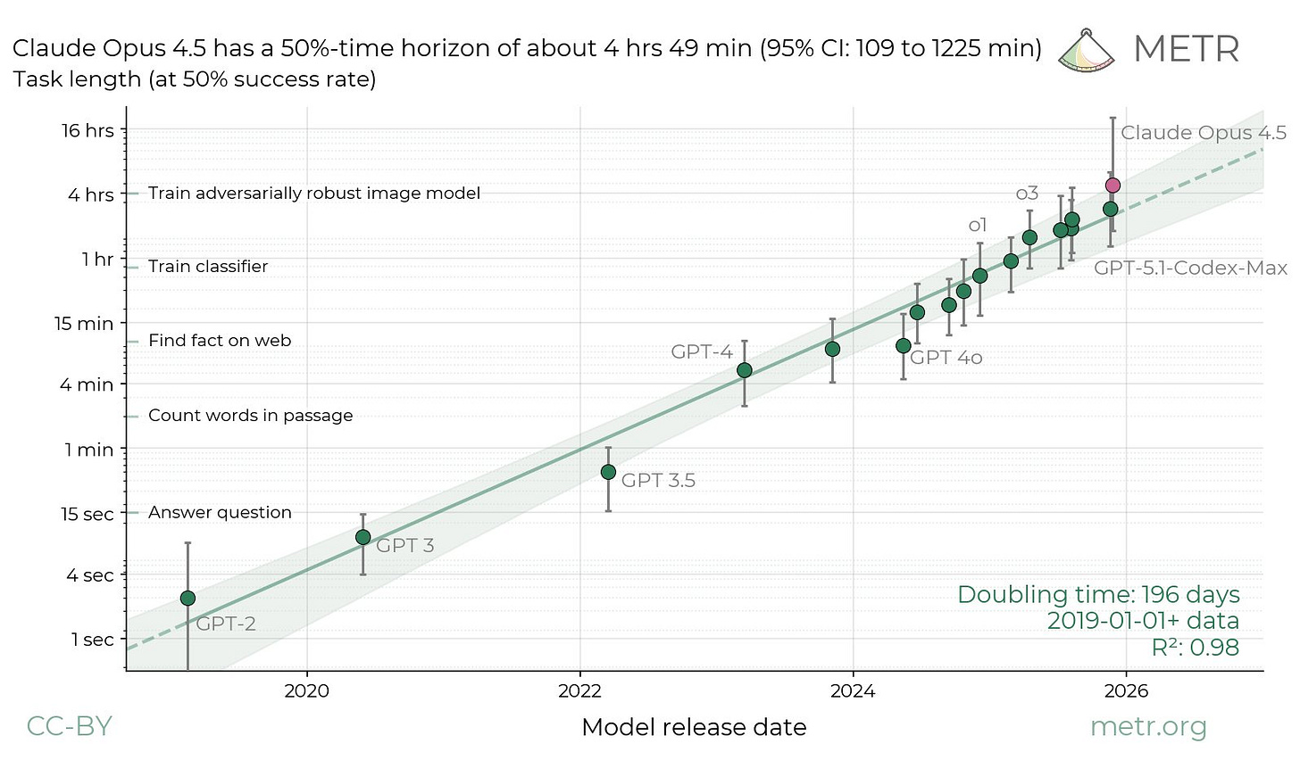 There is a lot happening here, so allow me to explain. The “time horizon metric” mentioned in the title measures something intuitive: if a human software engineer takes X hours to complete a task, and an AI agent succeeds at that task 50% of the time, then X is the model’s 50%-time horizon. It’s basically asking “how long of a task can this thing reliably handle?” Claude 3.7 Sonnet hit 59 minutes back in February. Claude Opus 4.5 just registered at 4 hours 49 minutes—nearly a 5x jump. METR’s broader analysis shows this metric has been doubling roughly every 7 months since GPT-2 in 2019. It is close to becoming a “Moore’s Law for AI agents”, and if you take the exponential seriously, the math gets spicy fast. We’d hit week-long autonomous task completion within 2-3 years, month-long projects by decade’s end.
