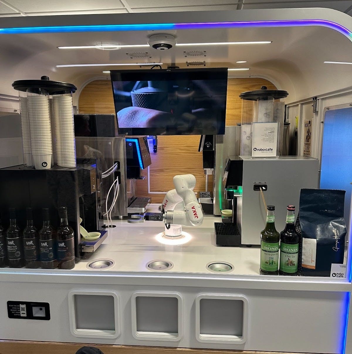 This is the Hestia Robotics Coffee Robot C1 PRO, operated by Robo Cafe USA. The manufacturer’s website boasts of it being able to make over 200 drink varieties with the various non-milks, oat, almond, and whatever, all available for consumer’s consumption. You can find similar robots on Alibaba for roughly $50K. That little white arm in the middle moves the coffee from espresso machine to milk frother, slowly connecting a caffeinated potion. By automating the barista’s hands away, you also remove the need for a bathroom, benefits, or breaks. Instead, the human job at coffee shops like the C1 PRO is that of a vending machine dude going from coffee robot to coffee robot, refilling cups and oatmilk. This also means that the ideal entrepreneur of coffee shops won’t be coffee snobs, but instead people with connections in real estate and strong supply chain management experience.