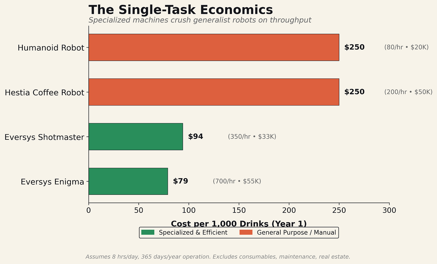 At those throughput rates, the math is brutal. Even though the Eversys costs $33,000-55,000 compared to the humanoid’s $20,000 bill of materials, the cost per drink is 3x lower because the machine is optimized for exactly one thing: making coffee fast.