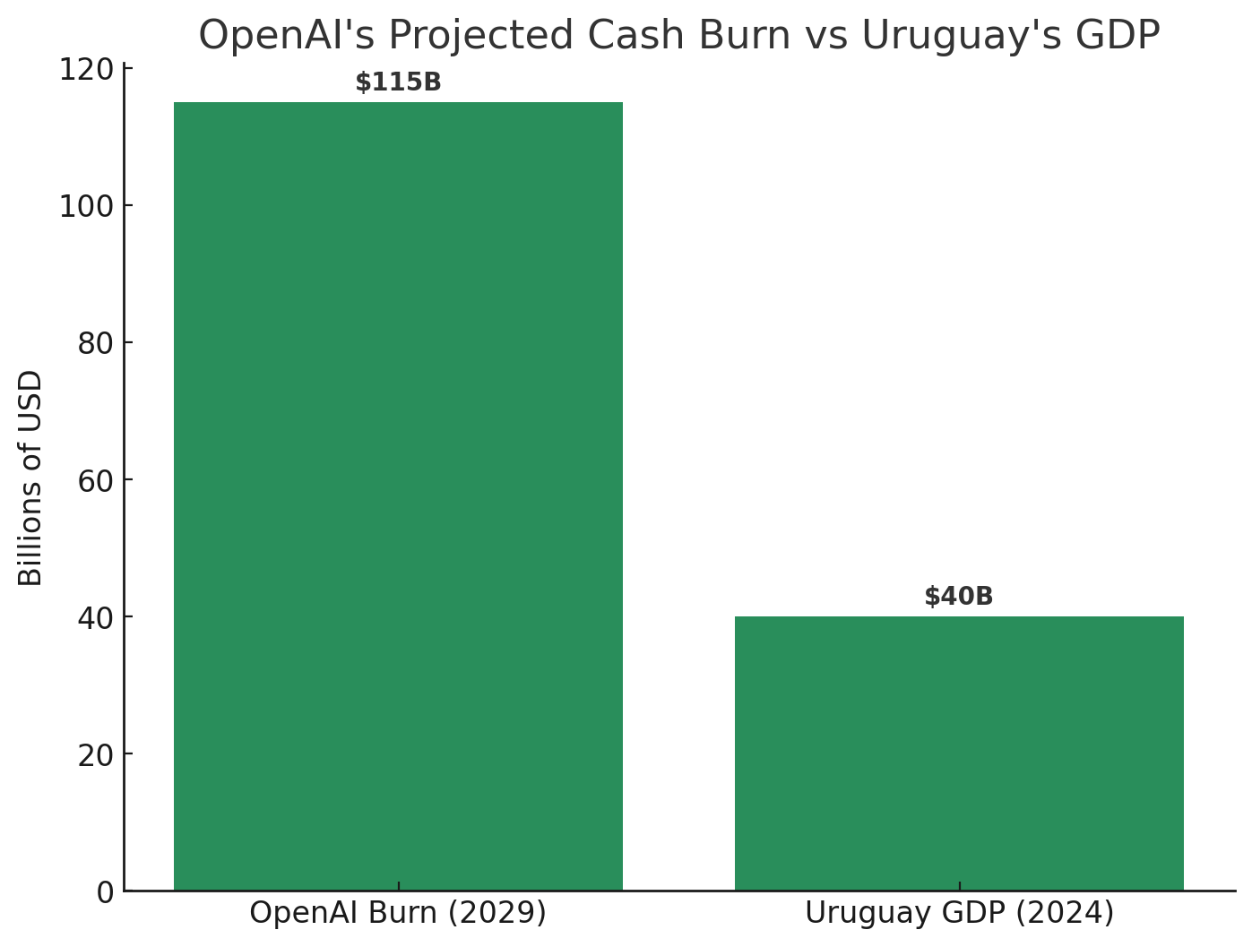 It is worth noting just how big these numbers are. Compare that cashburn to the current GDP of Uruguay to give you a sense for it. It isn’t apples to apples, but it is helpful to think about in terms of geography. OpenAI wants to burn through 3 Uruguay’s worth of cash in the next 4 years.
