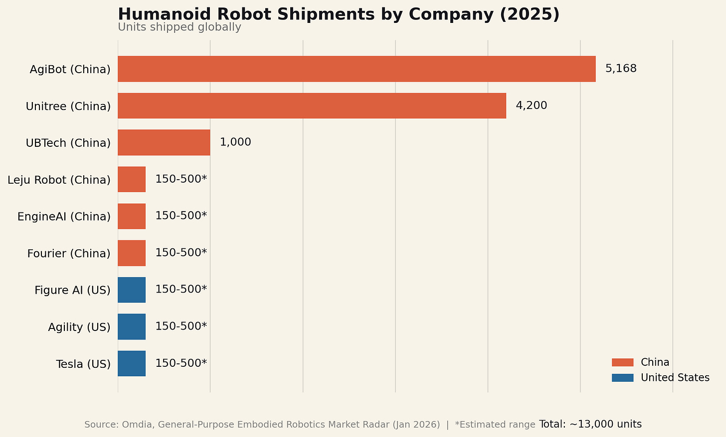 China is dominating in robotics manufacturing. While the total production numbers are tiny relative to the hype, just a measly 13,000 total, it is already reminiscent of earlier technology waves where China was great at manufacturing, but the core R&D wasn’t as good.