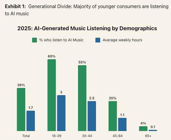 AI music is already bigger than you think. 60 percent of 18-20-year-olds are listening to 3 hours of it per week according to a new analysis from Morgan Stanley. This listening is done mostly via short-form video or playlists on YouTube, but I think the fact that the number can be this high and the world isn’t really changing all that much is telling. Unless you care about the individual artisan as a craftsman, or if there is some social element of where a friend recommends it to you, people don’t seem to notice if something is from AI.