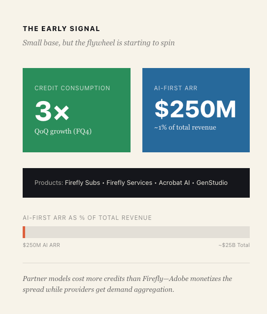 As always, the truth is to be found in where the money goes. Adobe runs everything through “generative credits”—a unified currency across all AI features. Partner models cost more credits than Adobe’s in-house model of Firefly. And the early signal is working, the Adobe team told me that credit consumption grew 3x quarter-over-quarter in fiscal Q4. It is still a small amount, Adobe’s “AI-first ARR” for products (Firefly subscriptions, Firefly Services, Acrobat AI Assistant, GenStudio) just crossed $250 million, roughly 1% of total revenue. But it suggests the engagement-to-monetization flywheel is starting to spin.