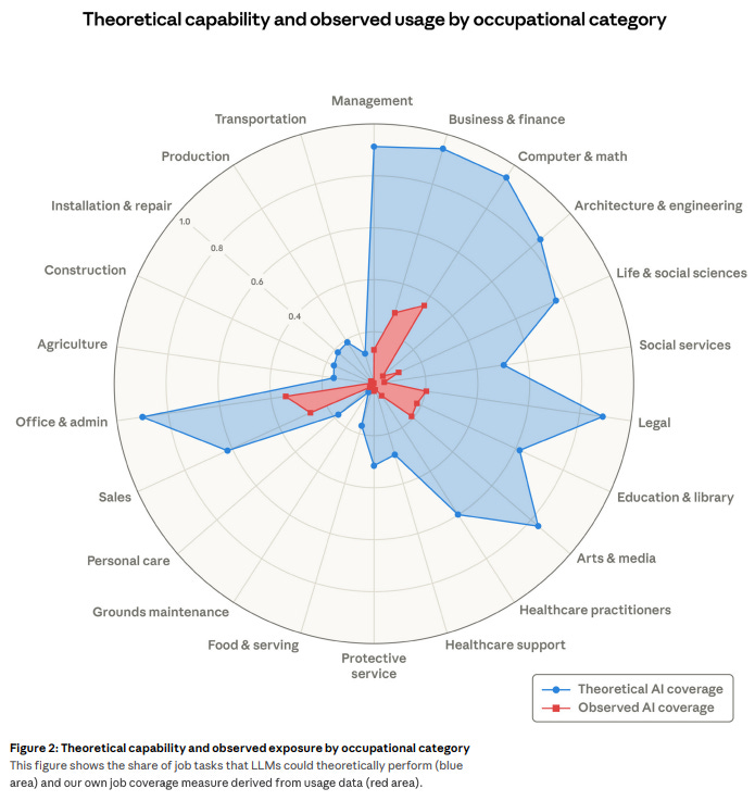 A March 2026 paper from Anthropic has been tracking millions of Claude conversations since early 2025 to measure what AI is actually doing across the economy. They broke every U.S. occupation into its component tasks using government labor data, then measured two things: theoretical exposure (what percentage of tasks AI could handle) and observed usage (what percentage people are actually using AI for). Computer and math workers have 94% theoretical exposure but only 33% observed usage. The gap between those lines is your window. But the gap is closing.