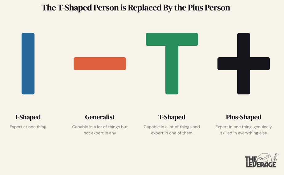 We are in the bundling phase of professional life. Career progression comes from automating depth and increasing breadth with the time that automation frees up. The go-to advice used to be that you should become “T-shaped,” an expert in one thing and capable in a lot of others. AI changes capable to adept.” I call this becoming a plus-shaped person. The vertical bar stays, you still need genuine depth in something. But the horizontal bar gets thicker. AI tools make it possible to operate at a genuinely skilled level across domains that used to take years to learn. The person who can write, design, analyze data, build prototypes, and manage projects isn’t spread thin anymore. They’re leveraged™.