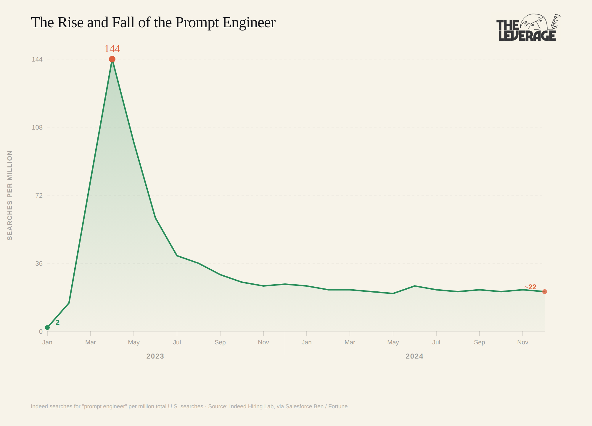 Indeed data tells the same story. Searches for “prompt engineer” surged from 2 per million in January 2023 to 144 per million by April 2023, a 72x spike in three months. By late 2024, they’d collapsed to 20–30 per million, where they flatlined.