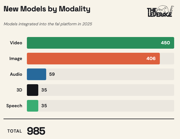 Generative media is going to take over this year. Last week, I warned you about the implications of the world’s best video models being indistinguishable from real-life videos. This week, it is important to point out how widespread this phenomenon is. In basically every way we have of interacting with the world, there is now an AI model that is near-indistinguishable from reality. Just in the last year, over 985 models were released on the fal platform, which helps developers integrate these type of models into their applications.