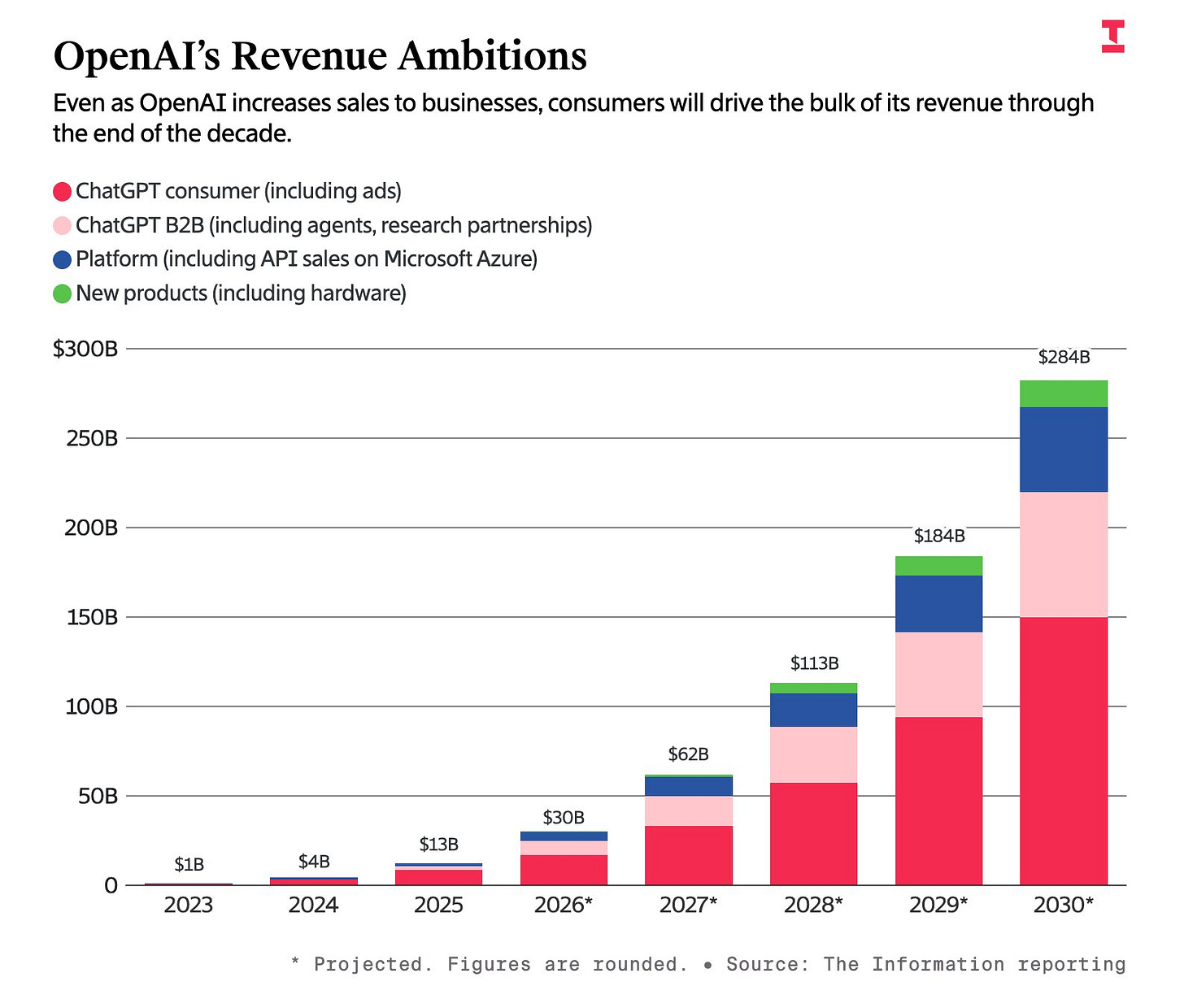 On top of all that, the long-term plan calls for ChatGPT to reach 2.75 billion weekly active users by 2030. For context, that’s a stricter engagement metric than monthly actives, where only Facebook, YouTube, and WhatsApp currently sit above 2.75 billion. OpenAI is essentially betting they can build one of the three or four most-used products in human history in the next four years. You add in the consumer hardware, the B2B sales, the research partnerships, the “new products” bucket that’s supposed to generate $1.3 billion next year with still-TBD details, on and on, and this is simply too much for any one company to pull off in this time frame. I love ambition! I really do, but I just think this is too much. To the OpenAI investors who read this newsletter, I would love an off the record conversation about all this. What does this analysis get wrong? Are you feeling nervous?