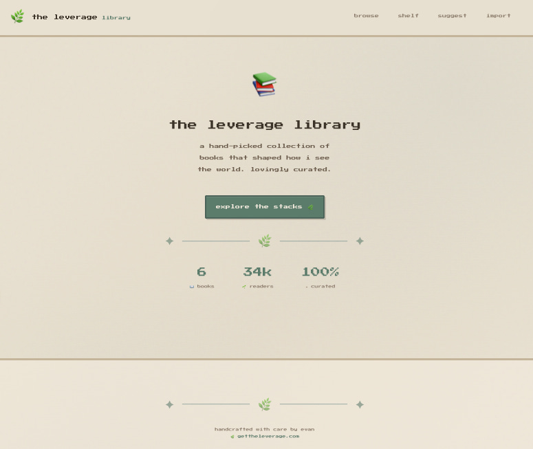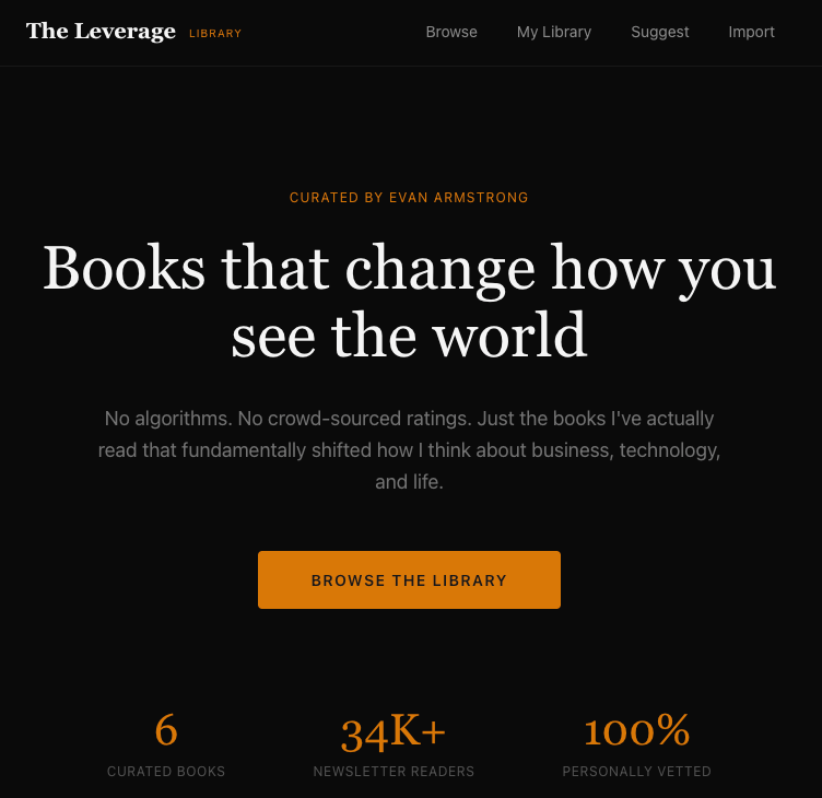 For example, I’ve been vibe coding a new project over the last few weeks. I’ve long thought that Goodreads is a terrible product that makes people entirely miss the point of reading. So, I’ve been experimenting in building something I call “The Leverage Library.” This would be a curated Goodreads experience, just for readers of this publication, where every book you see is hand-picked by our community.