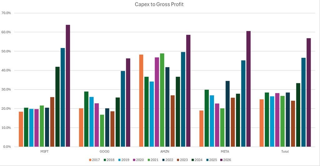 The data center spend looks reasonable for most of big tech. The last two years have seen a dramatic escalation in capital being spent for big tech to build out datacenters. X account modest proposal comments that “MSFT and META now are over 60%. Without an external facing cloud business (yet?), META is spending at or above the levels of the big 3 clouds. Capital intensity for the group is now up from an average of 27% (’17-’22) to 57%...If you take 2026 capex, and compare it to what each would be spending if capital intensity remained flat with the average pre-AI, it’s around $292.9B extra.” To accompany that analysis, that account shared this chart.