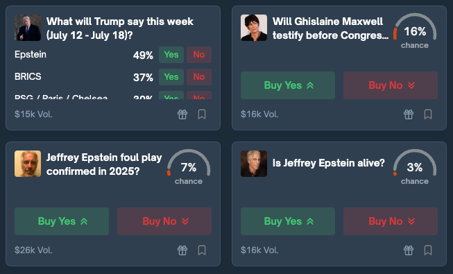 The markets are an incredibly unique source of truth. Say, for example, that you wanted to learn about what’s happening with Epstein. You can see the odds of Epstein-related events occurring by pulling open the prediction market of your choice: