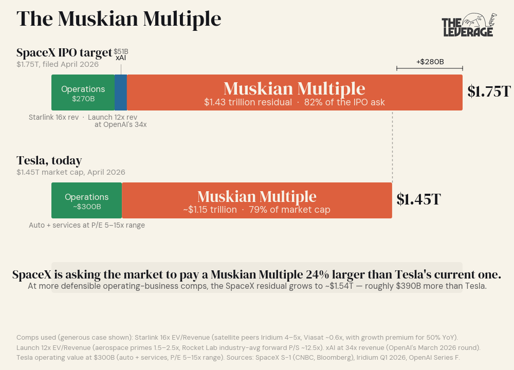 The SpaceX IPO is asking for roughly the same Muskian premium SpaceX needs — about $1.4-1.5T — that Tesla currently carries on top of its auto business. In other words: the prospectus assumes the public market will pay full Tesla-grade Musk premium for SpaceX, on top of fair value for rockets, broadband, and an AI lab.