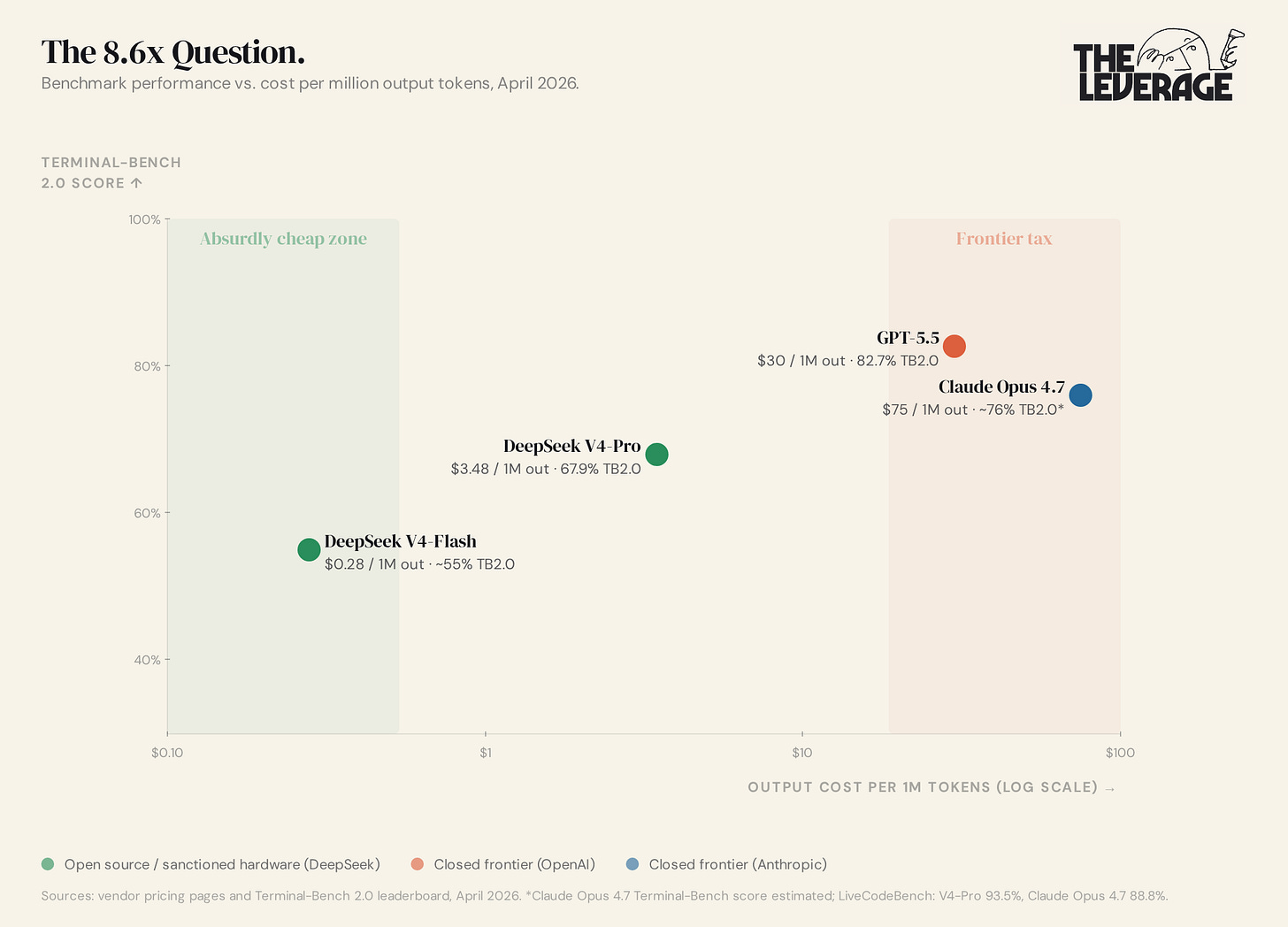 Is OpenAI back on top? Maybe? GPT-5.5 and open-weight model DeepSeek V4 dropped within 24 hours of each other this week, and at first glance Altman and Co would appear to have been cost-mogged. GPT-5.5 costs $30 per million output tokens. V4-Pro costs $3.48. Layer in DeepSeek’s 80-90% cache-hit discount and the effective gap stretches to 43-107x cheaper. Don’t be fooled by the numbers. Tokens are not, and will never be, the unit of value. What matters is what those tokens can actually do. A model priced higher per token that ships the same task in a third of the tokens is cheaper, not more expensive, and GPT-5.5 is tuned to spend fewer reasoning tokens reaching an answer. The same logic applies to the benchmarks. A model scoring 5% higher on a test does not give you 5% better outcomes in real work — that’s like believing every 5 lbs you add to your bench press gets you laid 5x more often.