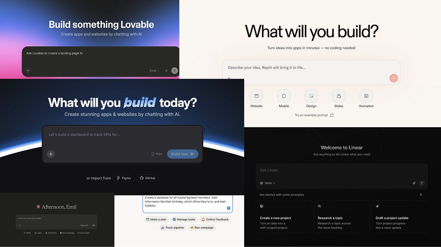 The input side has converged on a text box. You type or speak what you want. There is a single component that absorbs infinite intent. That side (seemingly) needs little design. It feels like every app on the planet now opens to a text box.