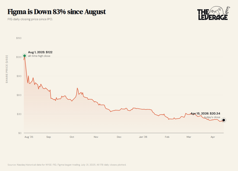 What is happening to design is the canary, not the coal mine. Design is the first creative knowledge profession where both the input and the output are being automated at the same time. This has resulted in a hollowing of the profession. It is an extinction level event for previous design workflows, as best shown by Figma’s nearly 85% collapse in stock price since August.