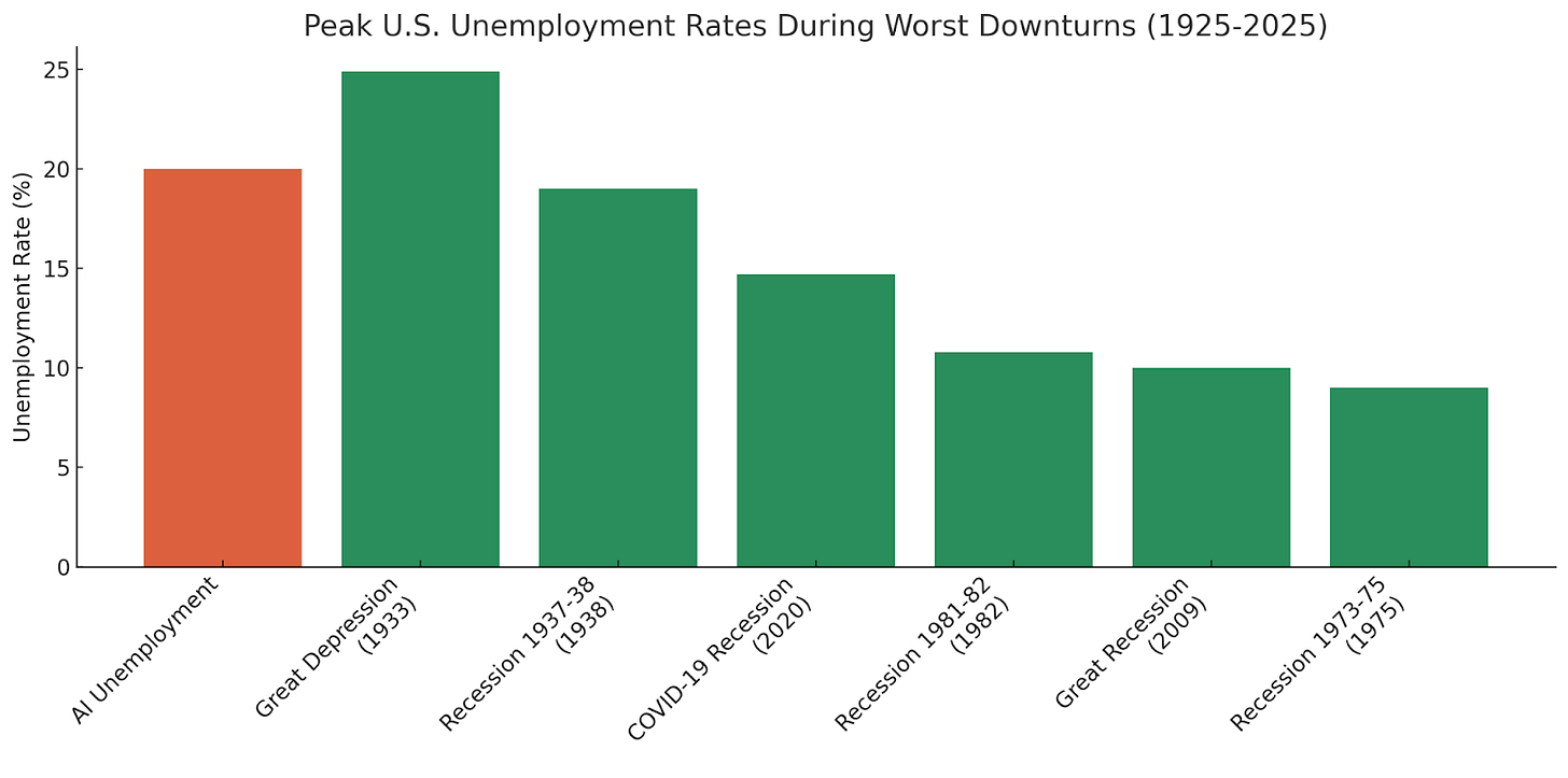 An unemployment rate of 20% is an economic catastrophe. For comparison, look at the projected AI unemployment rate compared to previous depressions and recessions.