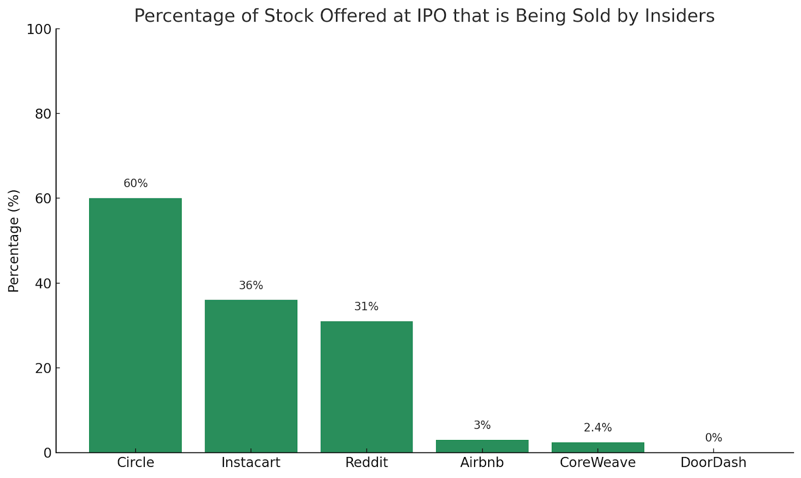 If Stablecoins are good, why does their IPO suck? As I’ve previously written about ($), I’m a big fan of stablecoins. It's the first crypto use case that I can wholeheartedly get behind. This week though, news broke that made me doubt myself. Circle, the issuer of the USDC, a stablecoin pegged to the U.S. dollar, filed their S-1 in anticipation of going public. However, insiders at the company like executives and investors, are selling an incredible amount of stock. Inside stock represents 60% of the pool up for offer, which is the highest that I can remember in the last 10 years of tech. For comparison, look at some notable companies over the last few years.