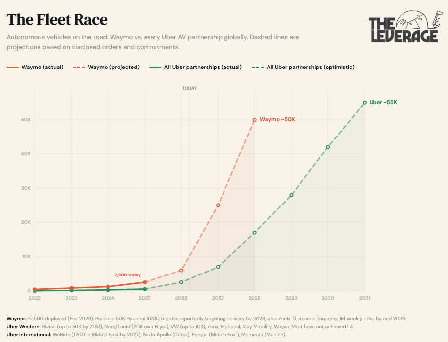 This week I got nerdsniped by Uber’s CFO claiming they’ll have the largest autonomous vehicle fleet on Earth by 2029. So I pulled the partnership announcements, the capital deployment schedules, and the SEC filings, and I ran the numbers myself. Spoiler: they won’t. Most of their partners haven’t actually solved autonomous driving yet, which feels like a prerequisite.
