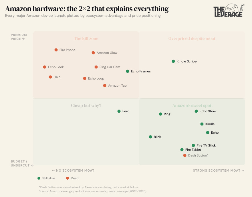 If you look at the history of the company’s consumer hardware efforts, the most successful efforts have either been products at significantly lower prices or utilized Amazon’s ecosystem advantages. So, for example, the Fire’s failure came because they tried to do an existing category at premium prices while the Kindle made an existing category radically cheaper (and offered new technology with e-ink).
